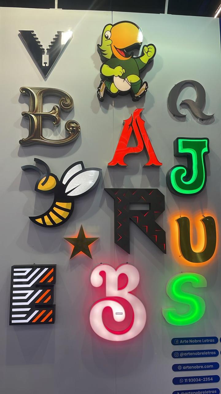 Letras caixa e letras técnicas em aço, PVC, acrílico e impressão 3D, com acabamento profissional e alto padrão visual.
